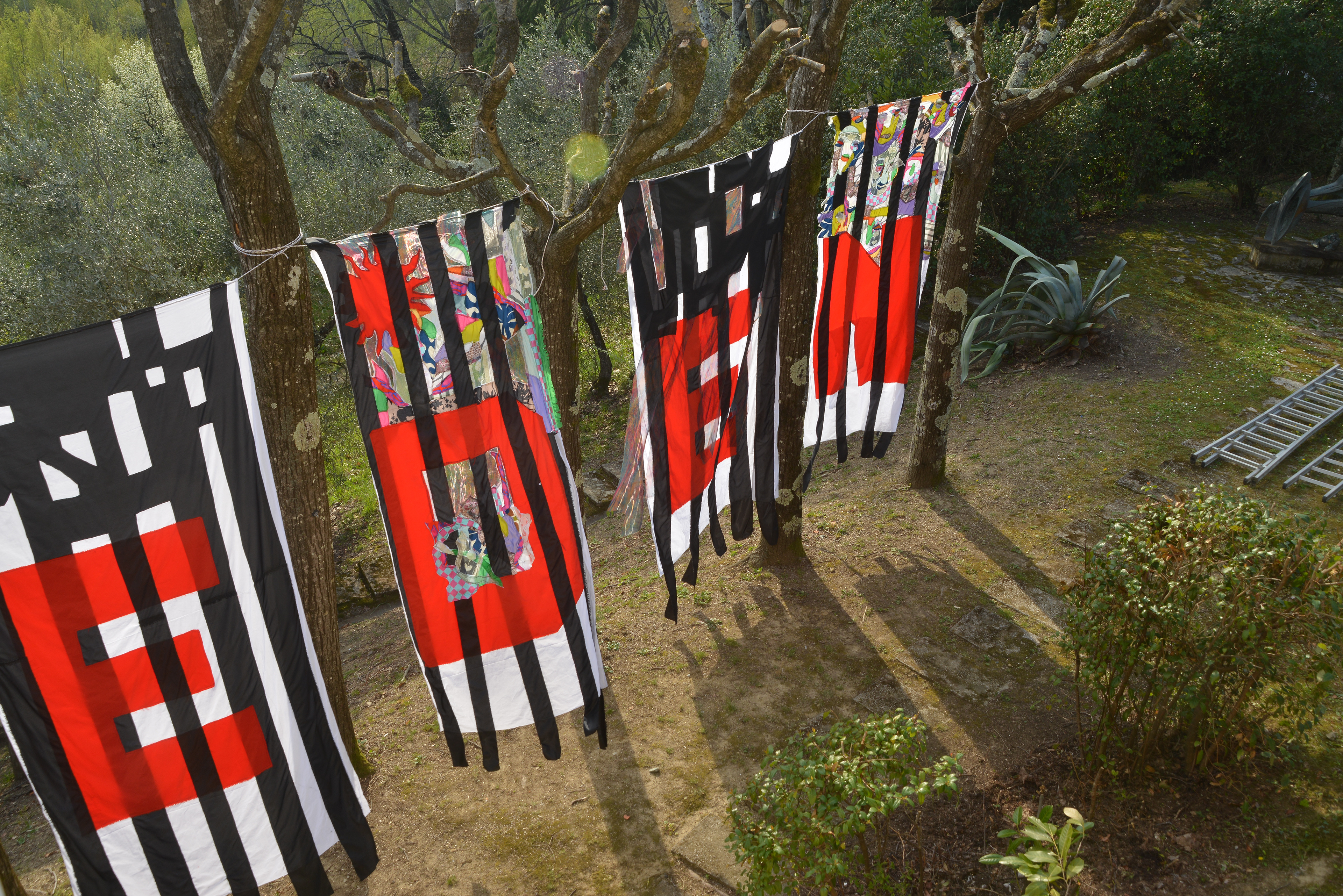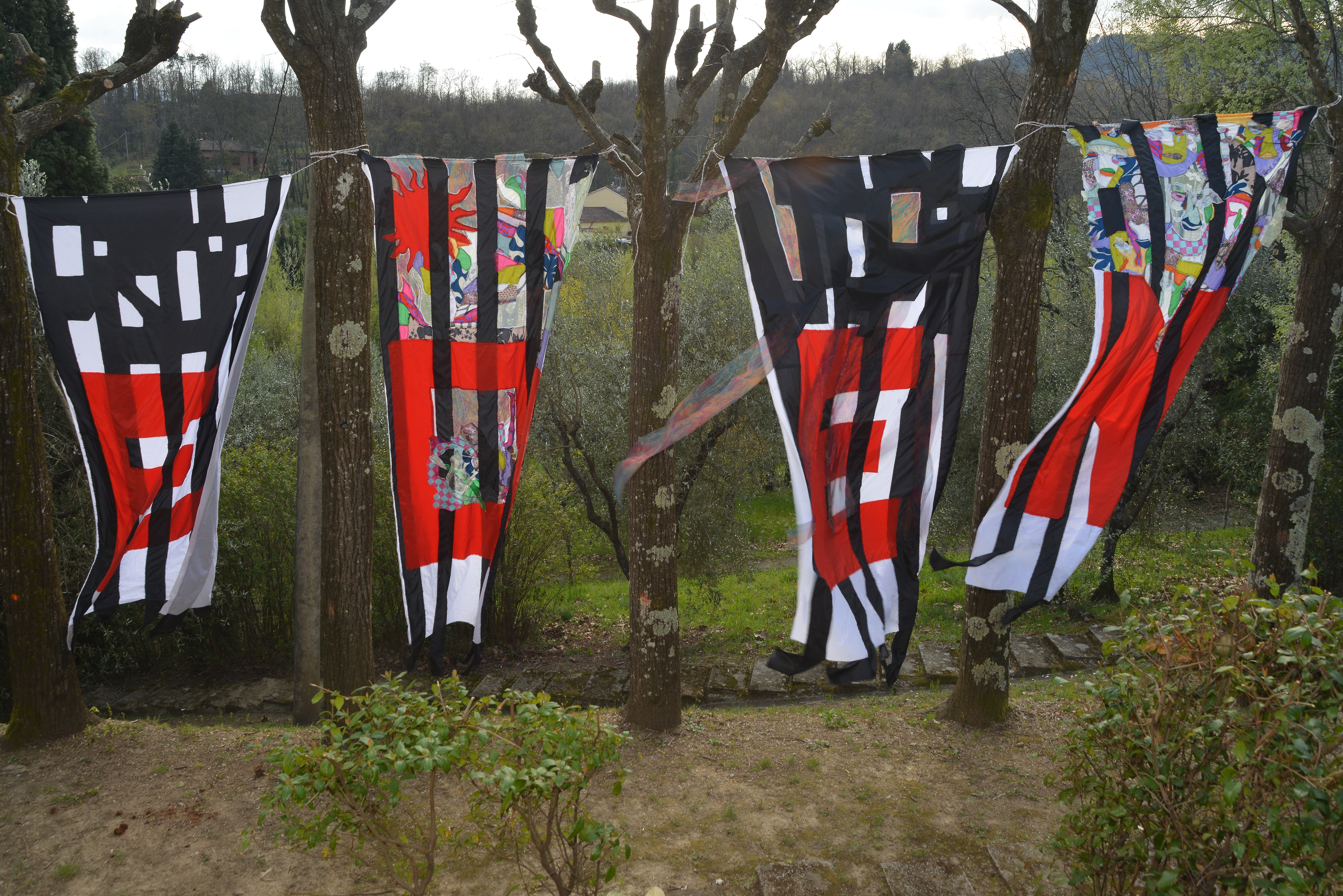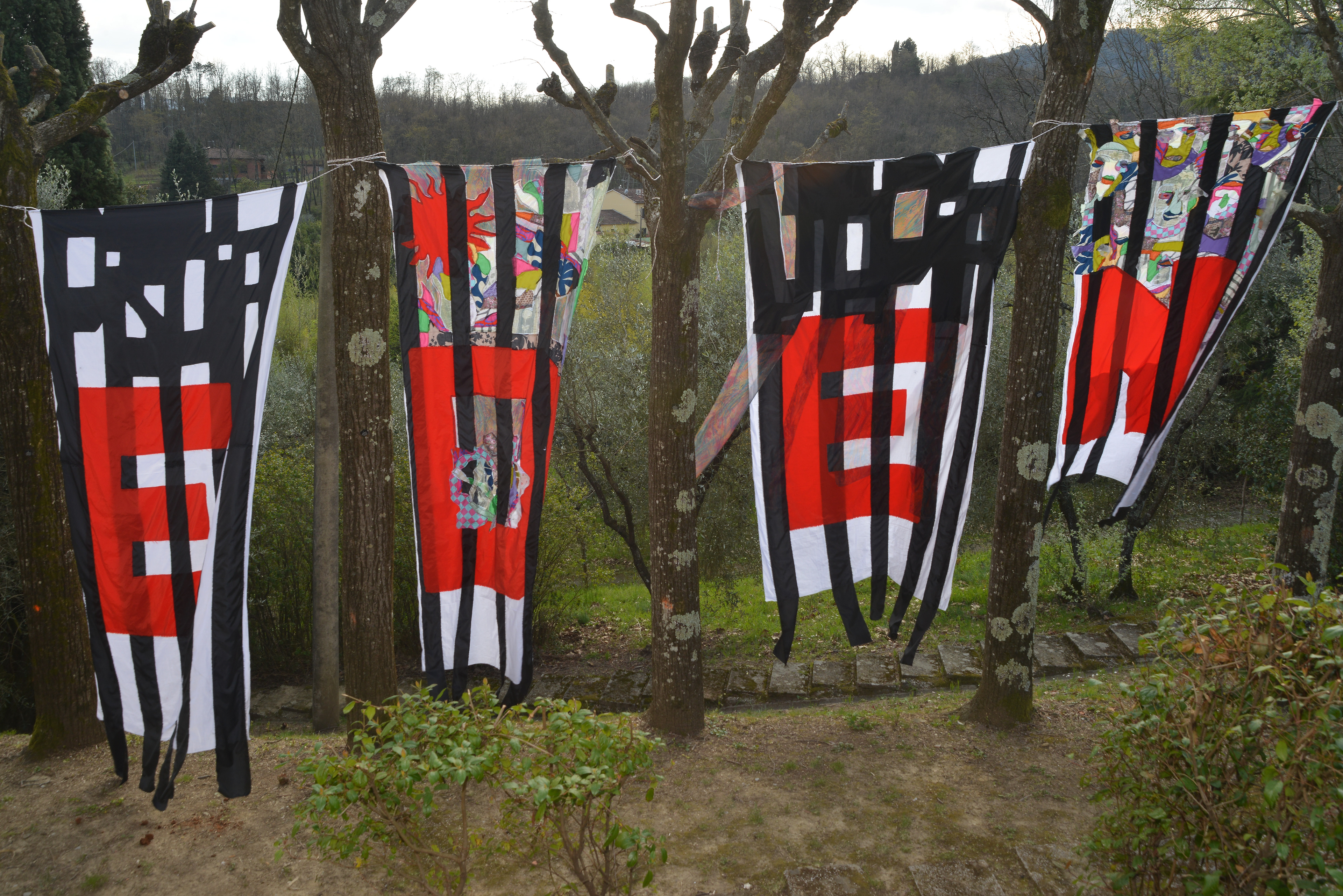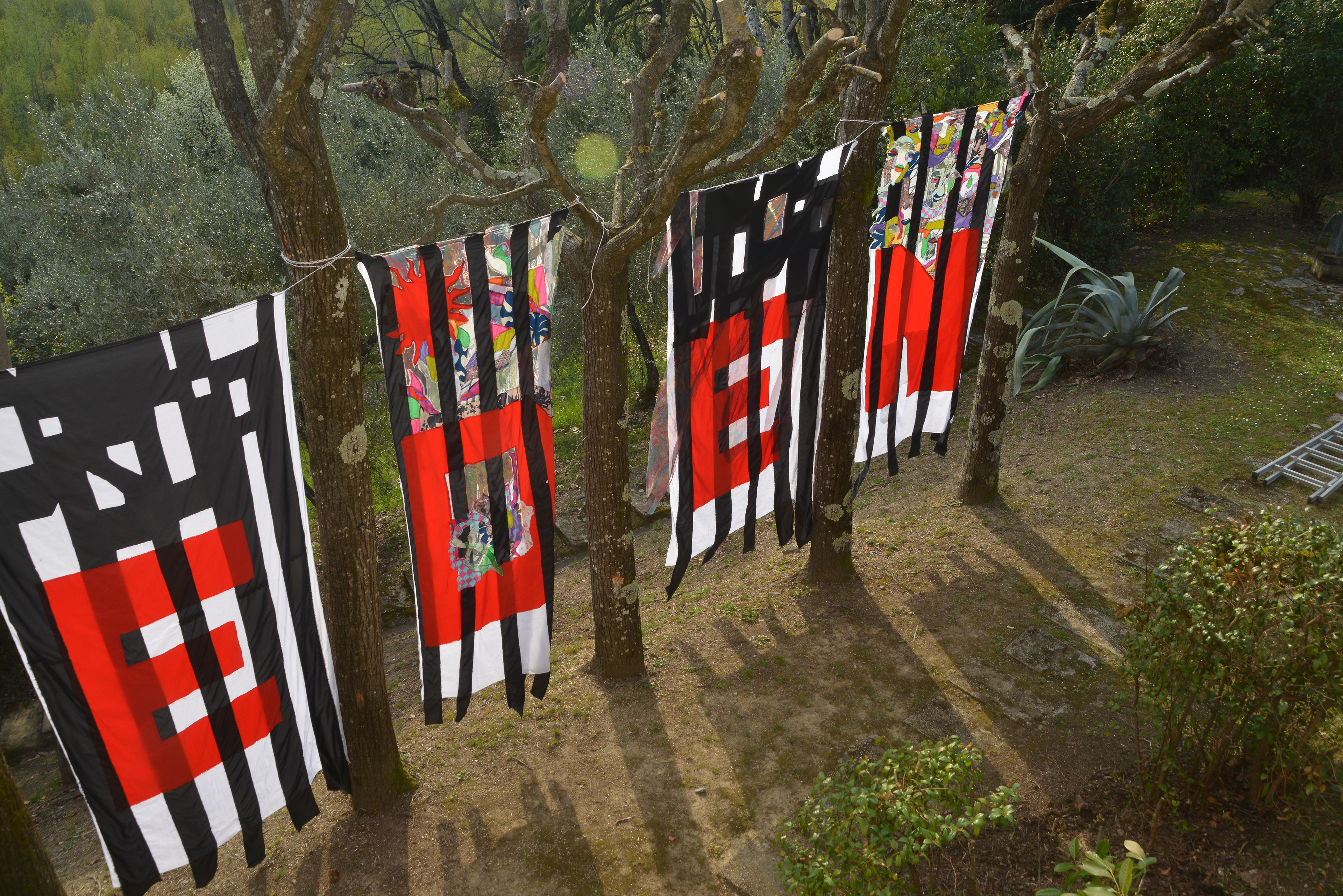 Die Arbeit übersetzt diese Fragestellung in vier textile Fahnen, installiert im Garten der Fondazione.