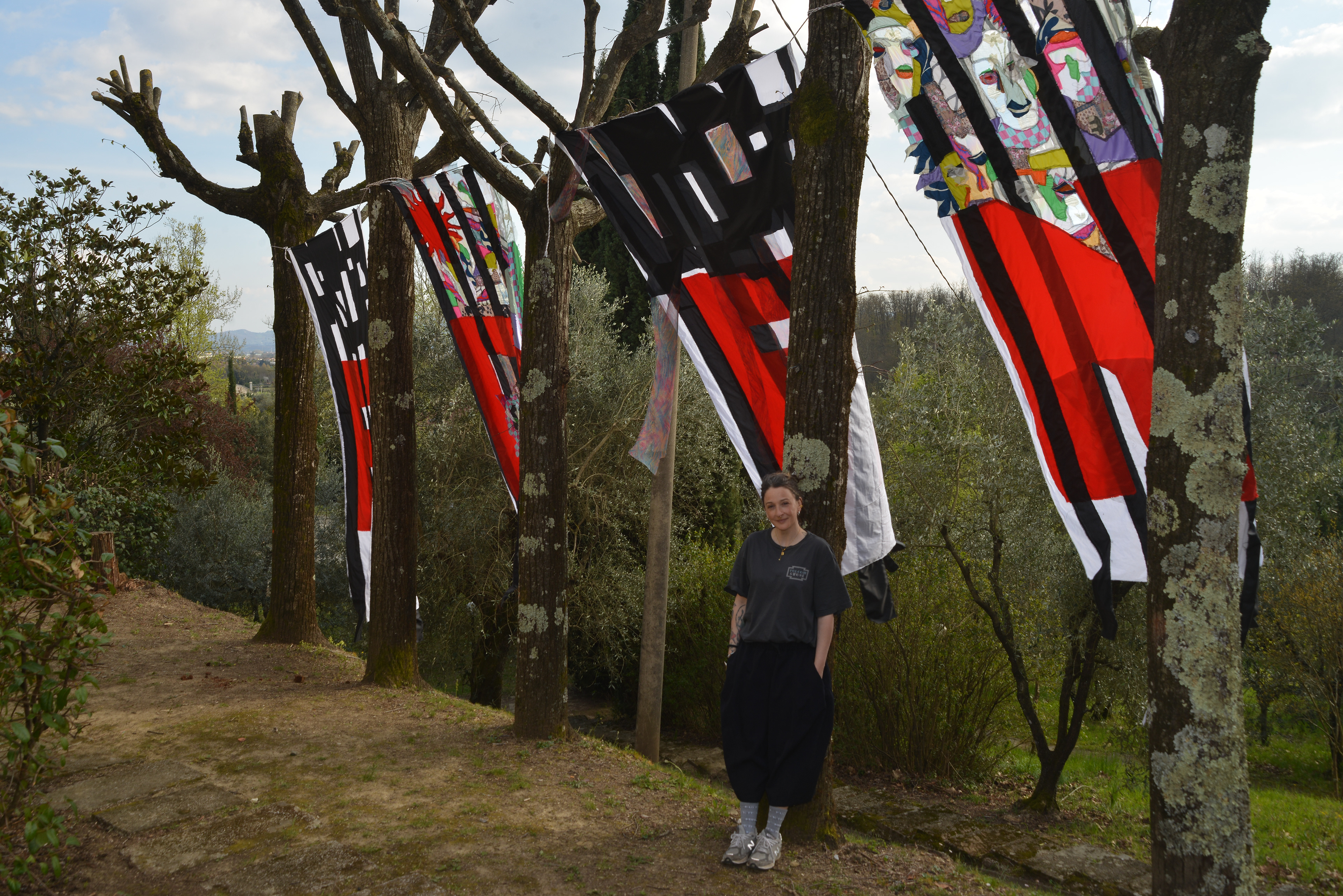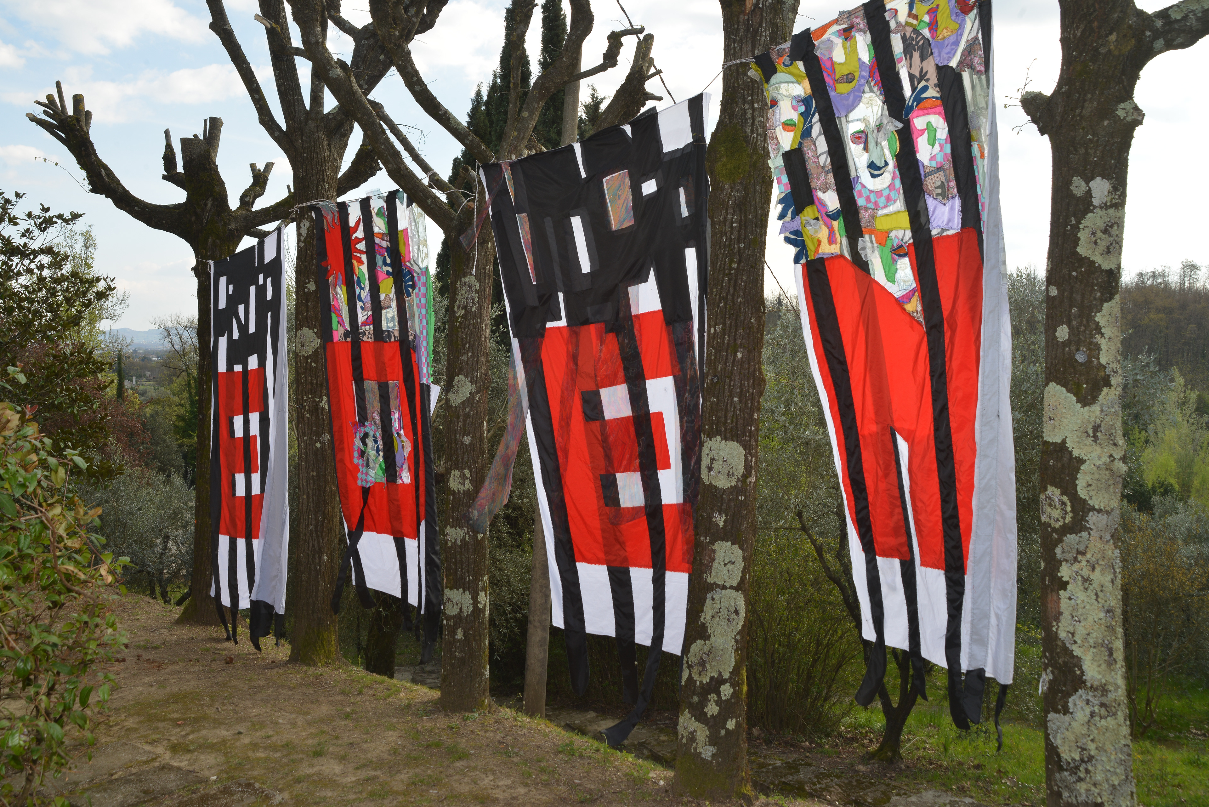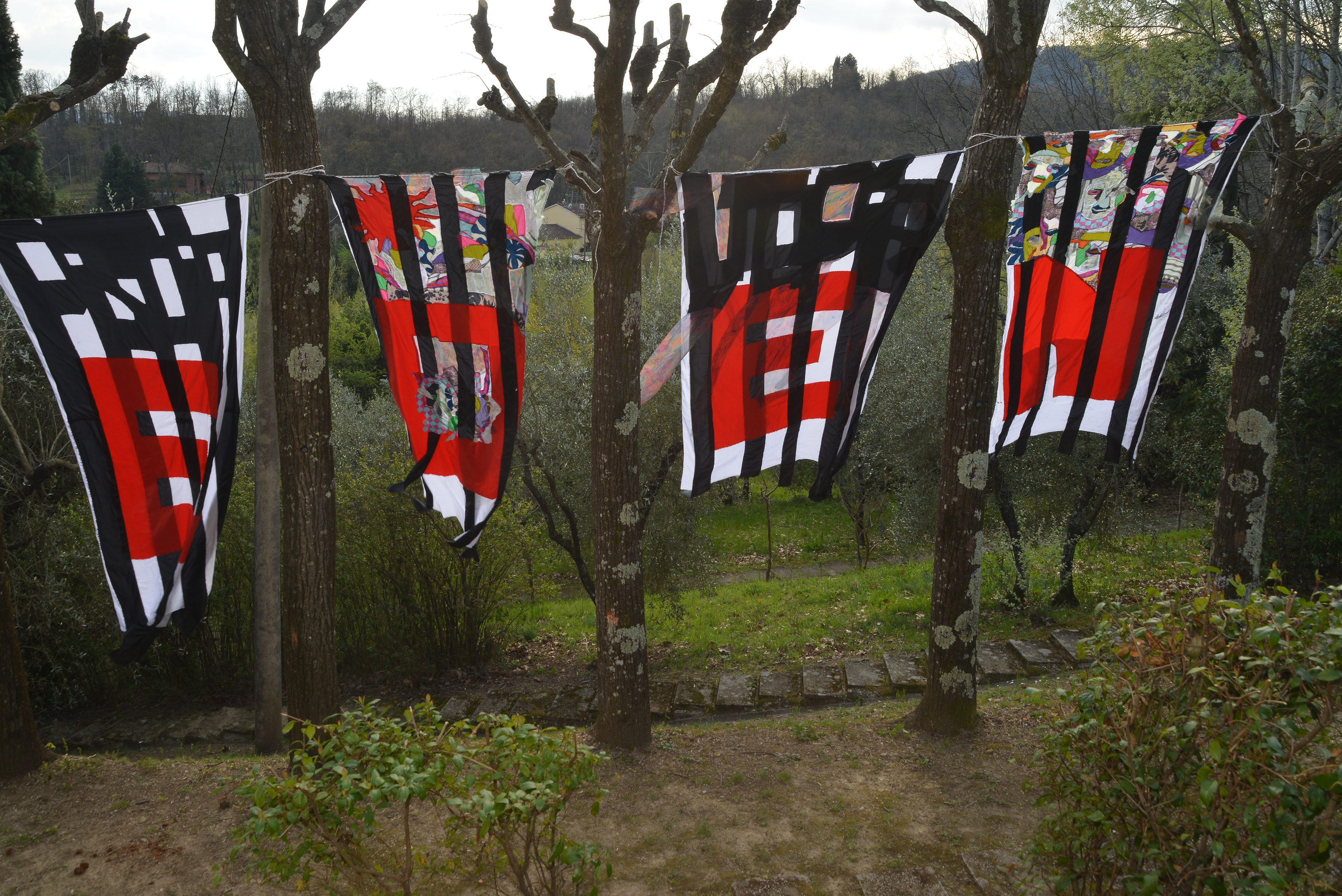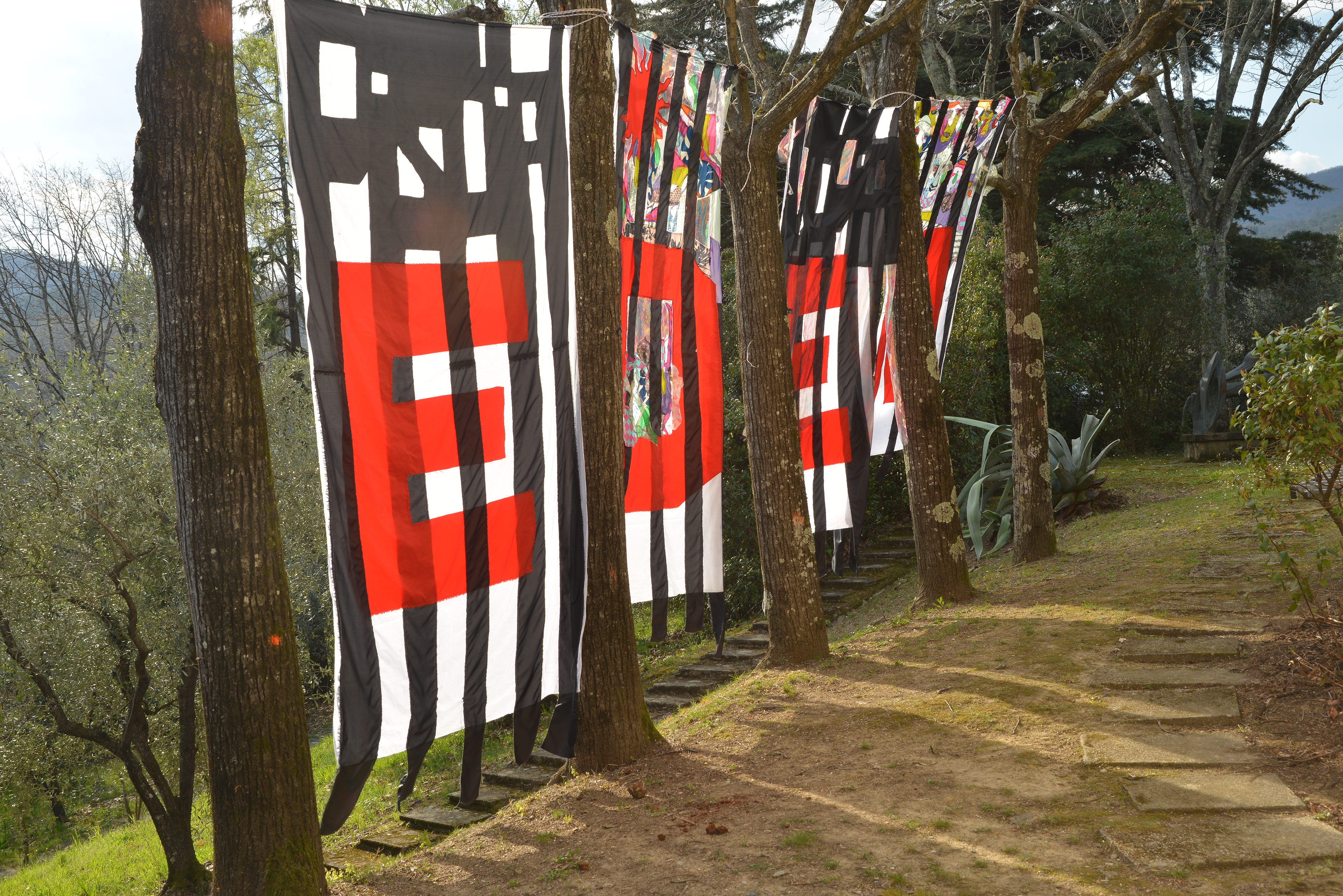 Die Arbeit übersetzt diese Fragestellung in vier textile Fahnen, installiert im Garten der Fondazione.