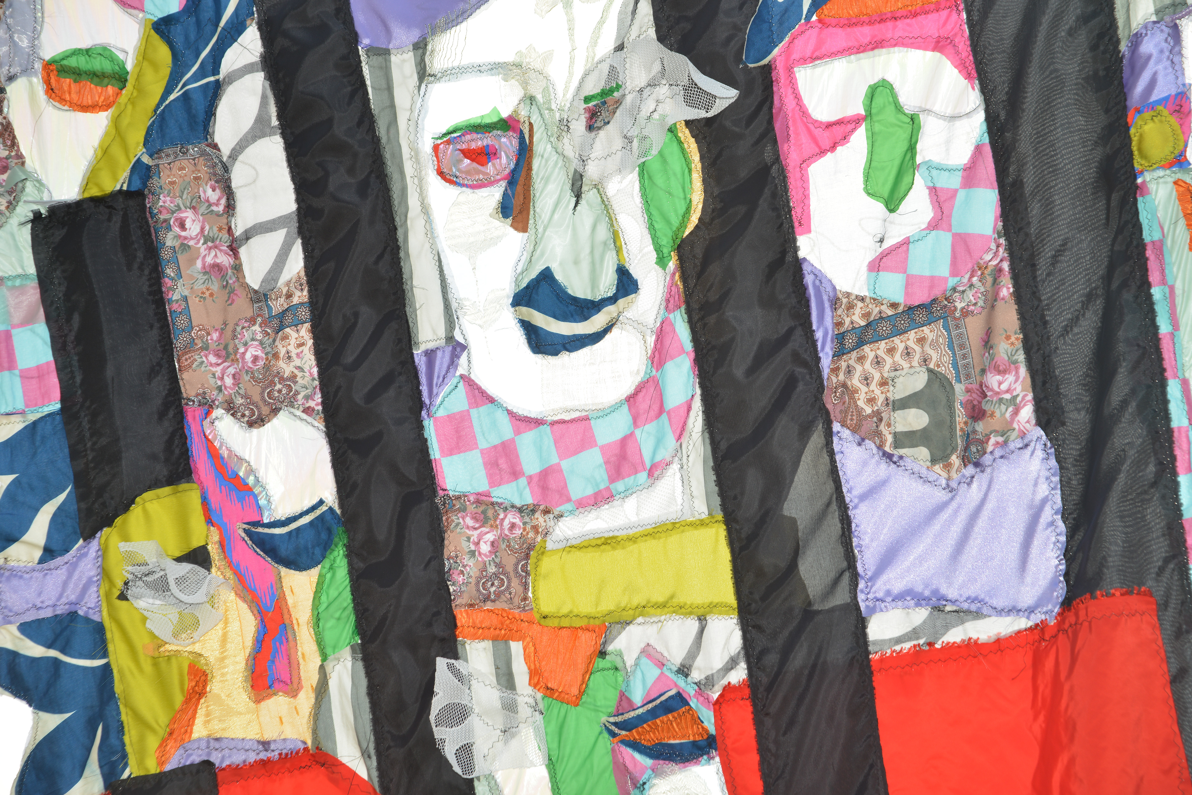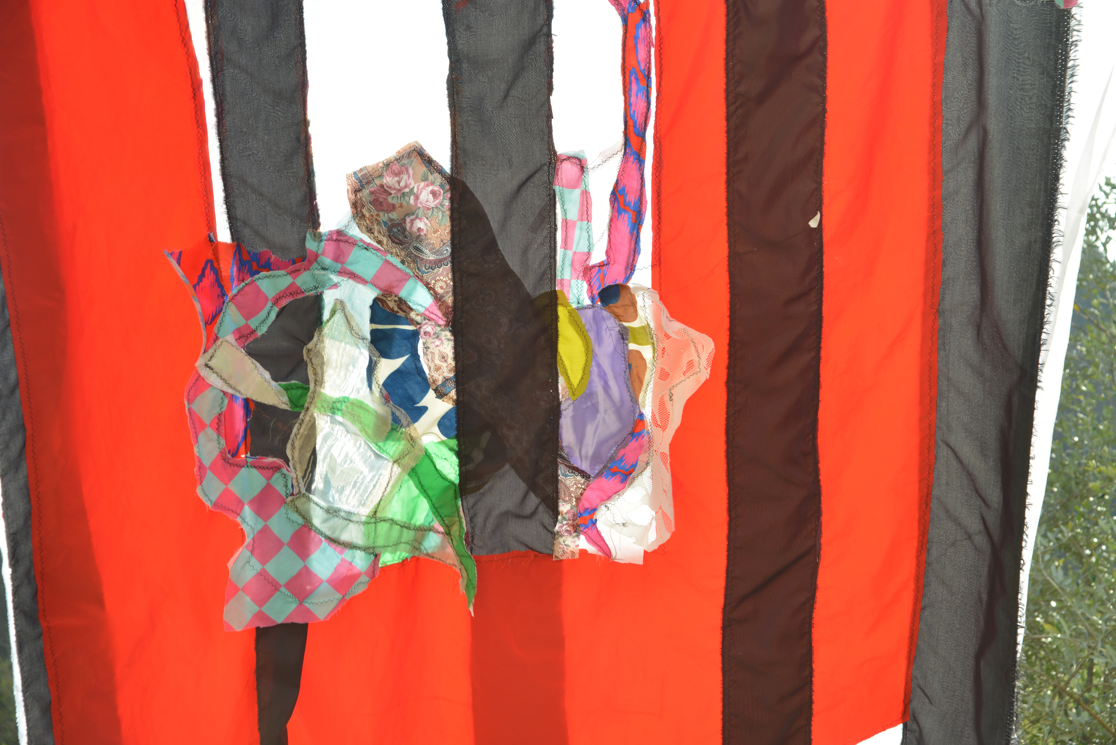 Die verwendeten Stoffe stammen vom lokalen Markt und verankern die Arbeit materiell im Ort.