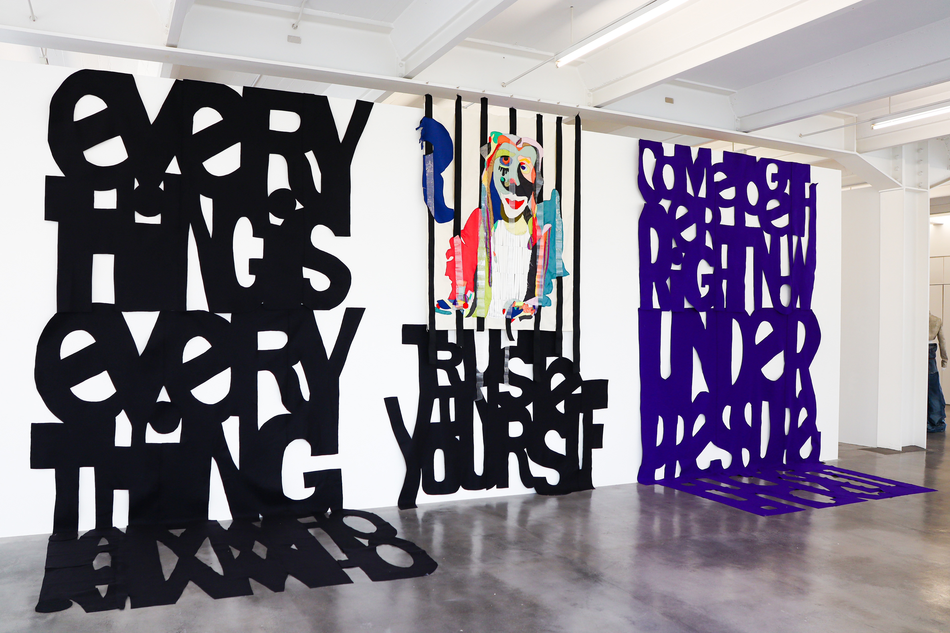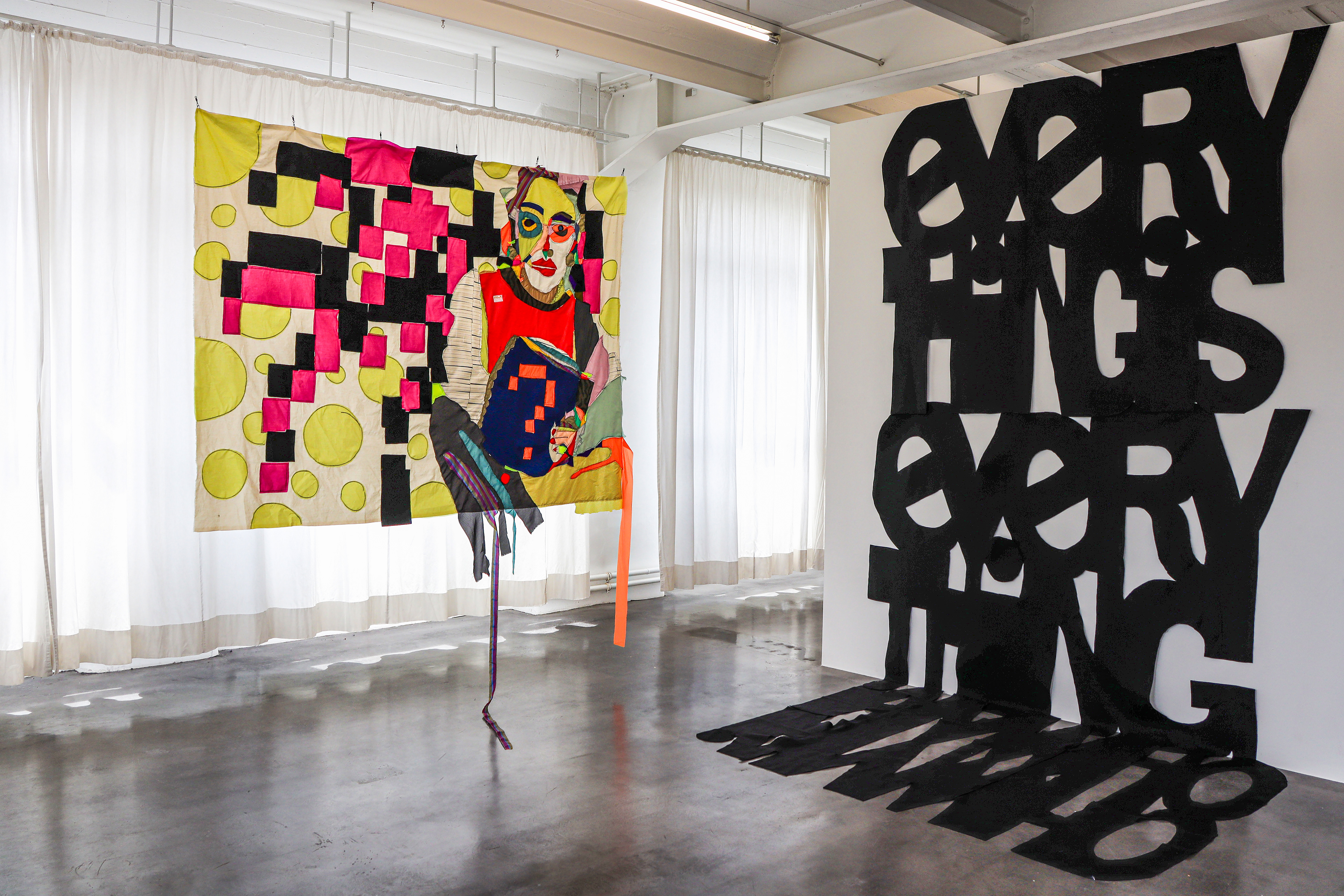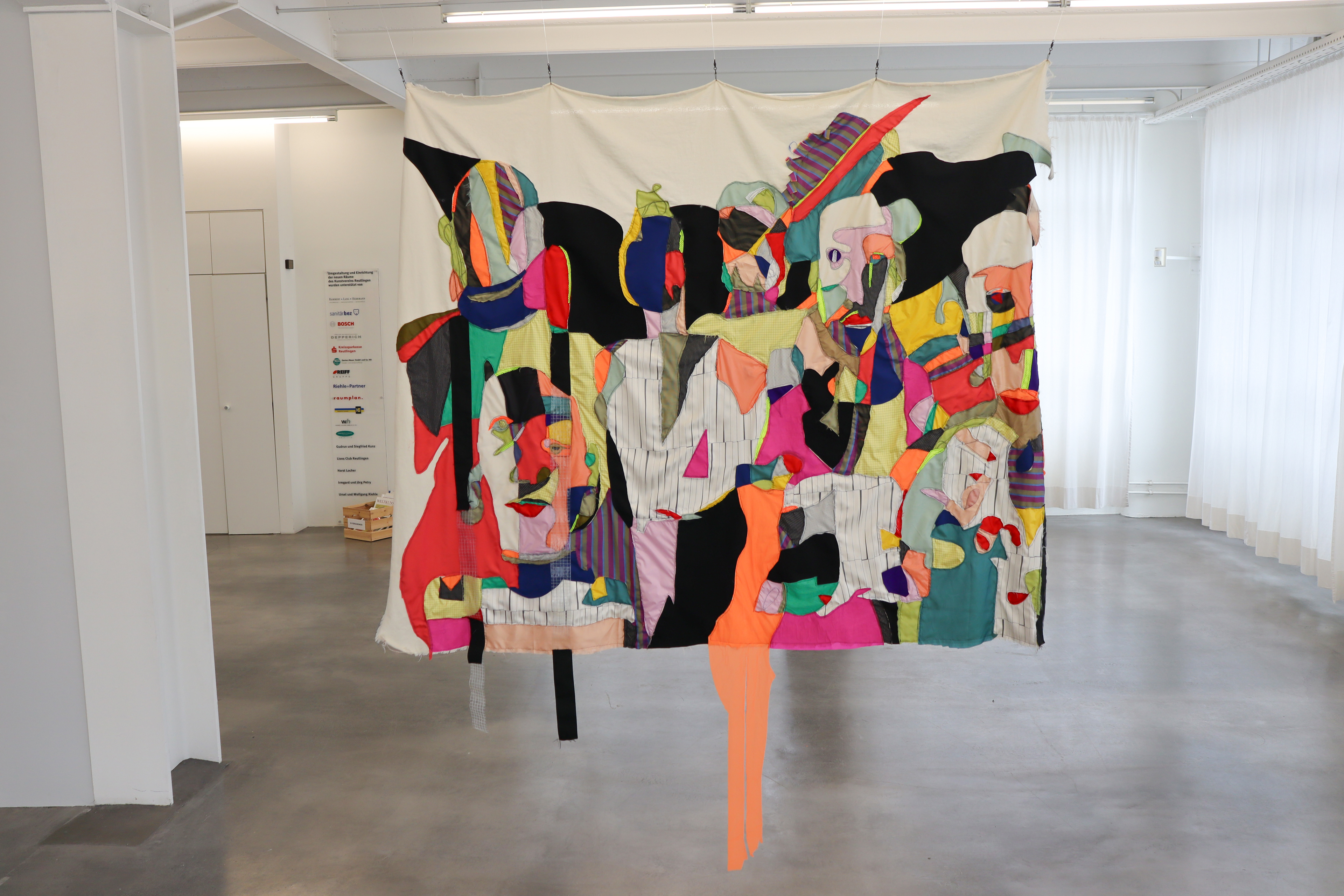 From Rags to Roots ist eine großformatige textile Installation, die Fragmentierung als Ausgangspunkt für Identitätsbildung und künstlerische Selbstverortung untersucht. Aus Stoffresten, textilen Zeichnungen und typografischen Elementen entsteht eine vielschichtige Collage, in der Brüche sichtbar bleiben und neu zusammengesetzt werden.