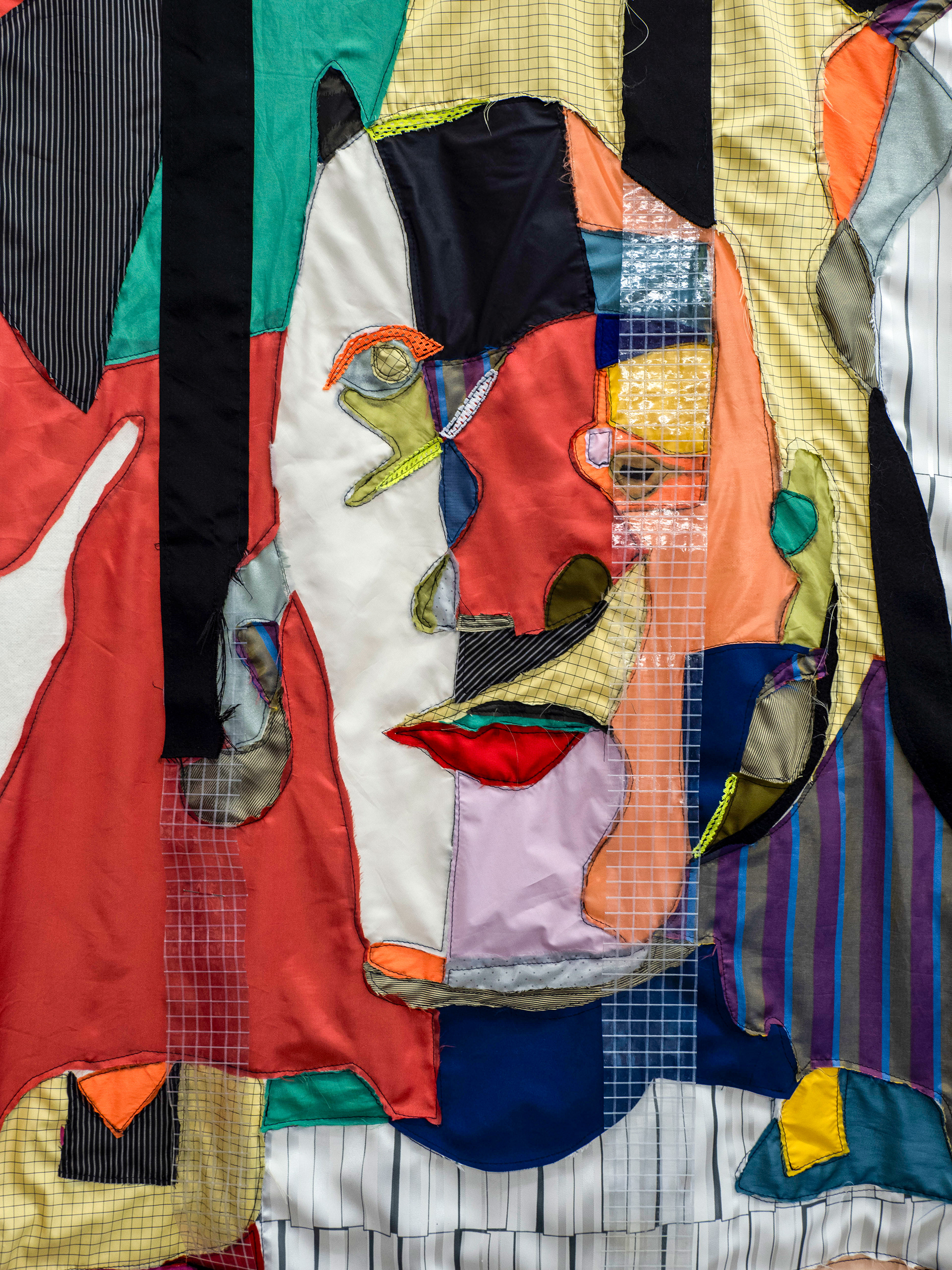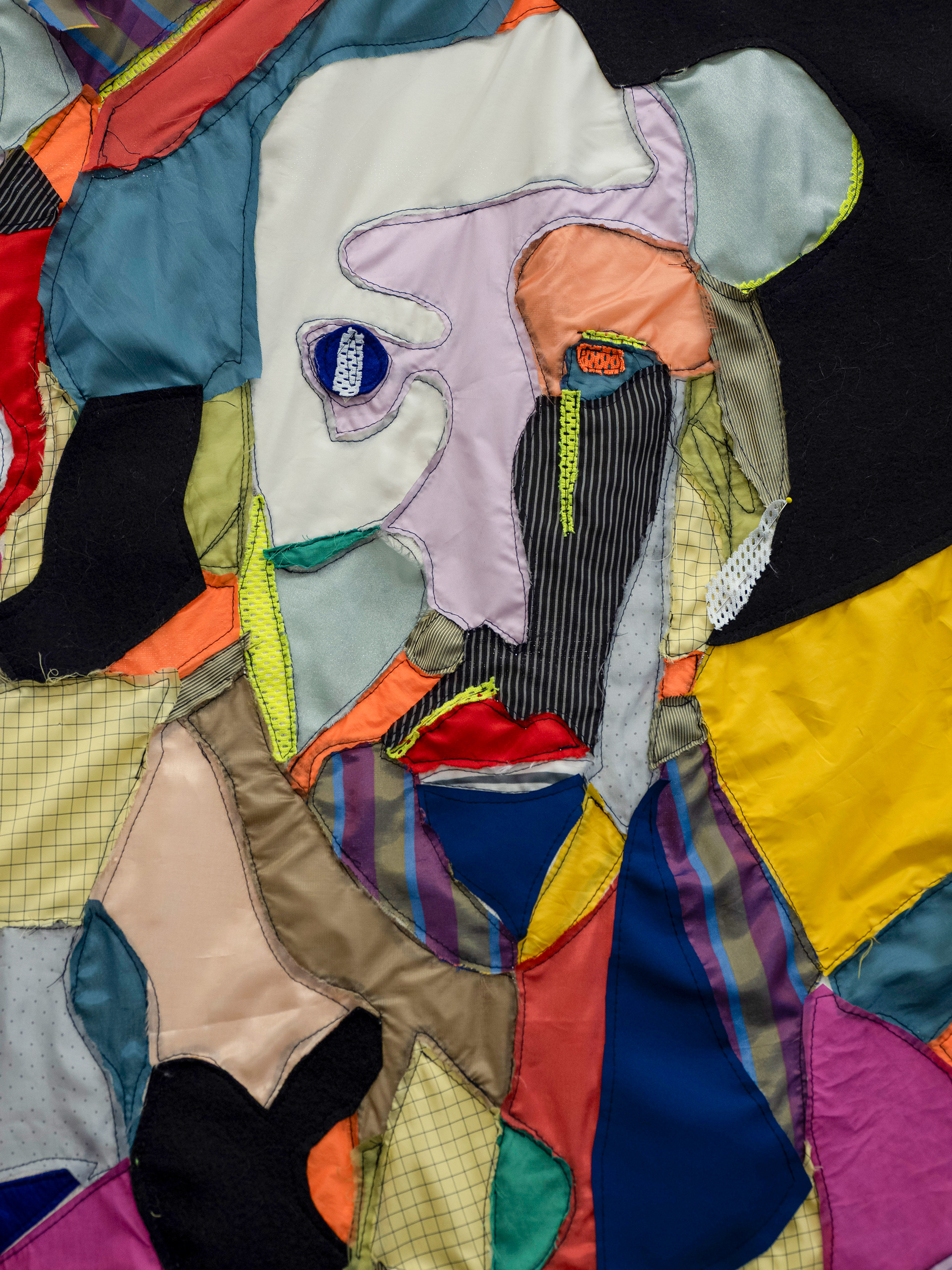 Textile Materialien fungieren dabei als Träger von Erinnerung, Prozess und Transformation. Durch Schneiden, Überlagern und Vernähen entwickeln sich neue visuelle Zusammenhänge, in denen scheinbar disparate Fragmente zu einer eigenständigen Ordnung finden.